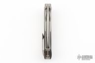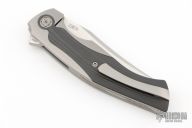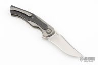 This Coyote Flipper Reate, designed by Emmanuel Le Brun features a two-tone finished blade with flipper. The handle has a blasted titanium frame and backspacer, carbon fiber inlay, titanium tip up clip. Very smooth. Nice detent, lockup and blade seating. Comes with zipper case. Excellent condition.