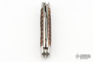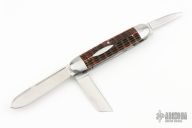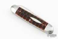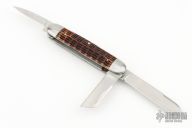 This Three-Blade Sleeveboard by Bill Ruple features hand rub satin finished blades with nail nicks. The handle has stainless steel bolsters with integral liners, jigged bone covers with a stainless steel escutcheon, stainless steel springs. Half stop blade positioning on both blades, flush in all positions. Comes with a zippered case. Excellent Condition.