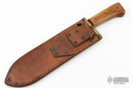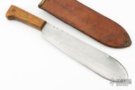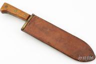 Broad, non-tapering chopping blade swelling towards the point, with round tip and false edge, 11 3/8 inches long, 16½ inches overall. Thick wood scale grips secured by three brass rivets to the exposed tang. Brown leather scabbard with brass throat piece, webbing hooks and grommet hole at the chape.
