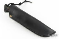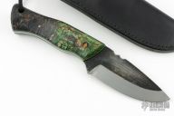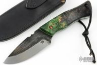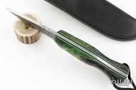 This Lunar by TS Custom Knives features a drop point hand rub satin finished blade with a notched thumbrest, .163" blade stock and 1.595" blade depth, full tang construction. The handle has stabilized wood scales with green/black liners and lanyard hole. Comes with a black leather sheath and COA. New from maker at the 2024 Blade Show.