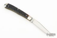 This Trapper by by Queen Cutlery was made as a production knife for Master Smith PJ Tomes features a polished blade with nail nick. The handle has nickel silver bolsters, jigged bone covers, brass liners and stainless steel spring. Excellent condition.