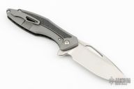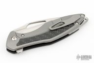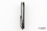 This Arius by Koenig knives features a brighwashed w/ PF finished blade with thumbhole and flipper. The handle has a smooth carbon fiber and bead blasted titanium frame, titanium tip up clip with hidden screws, and a titanium backspacer. Raised carbon fiber inlay. Has ceramic bearings and a ceramic detent ball. Nice detent, lockup and blade seating. Comes with original box and COA dated February26, 2024. Excellent Condition.
