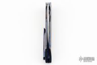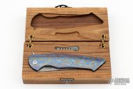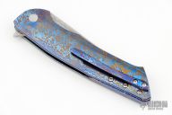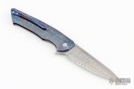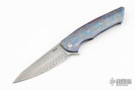 This Mantis Flipper by Herman Knives features a Damasteel blade with flipper. The handle has a milled Timascus frame, titanium liner, and matching Timascus tip up clip and backspacer. Nice detent, lockup and blade seating. Rides on bearings. Comes with original wood box.  Excellent Condition.