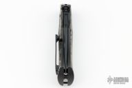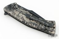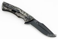 This S5 "Jigsaw" is an impressive collaborative knife design from Zieba Knives and Jason Knight. Its rounded titanium frame lock handle is contoured for comfortable use, and has a laser engraved finish. The knife sports a unique harpoon style recurve black blade with stylized grooves and a flipper tab. The knife comes complete with a machined titanium pocket clip for secure tip-up carry. Titanium handle construction provides a durable, lightweight frame. Steel lock bar insert for secure over-travel protection. Ceramic ball-bearing pivot makes blade deployment a snap. Comes with zippered. Excellent condition.