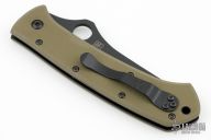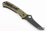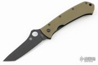 This Bob Lum designed folding knife by Spyderco features a black tanto style blade marked with the Lum Logo. Stainless steel liners. Textured green G-10 scales, tip up stainless steel clip. Comes with original box and papers. Nice detent, lockup and blade seating. New condition.