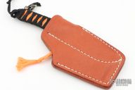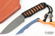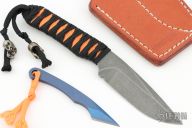 This Fixed Blade and Microdashi by Gavko Knives features a tumble finished chisel ground blade with .133" blade stock and .982" blade depth, full tang construction with flat paracord wrapped handle. Comes with a tumbled and anodized titanium microdashi, .157" blade stock and .498" blade depth, 1" blade length, 3.75" overall. Comes with a brown leather sheath. Excellent condition.