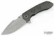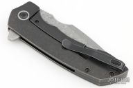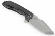 Model/Item/Part - K1036A3. Kansept Knives - Entity Framelock Damascus. 4.5" (11.43cm) closed. 3.5" (8.89cm) Damascus steel blade. Black stonewash finish titanium handle. Extended tang. Pocket clip. Black nylon pouch. Boxed. Made in China.