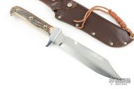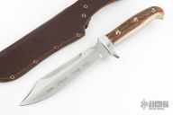 This Trapper Knife by Linder features a satin finished blade with a sharpened top edge, notched thumbrest and .222" blade stock and 1.309" blade depth, full tang construction. The handle has an aluminum guard and stag scales with rivets. Comes with original brown leather sheath. Excellent condition.