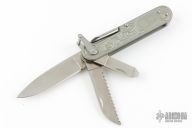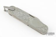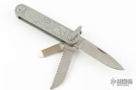This Multi-Tool by Al Mar features 3 satin finished blades with nail nicks and a Phillips head screwdriver on the back. The covers have been engraved by Robert Valade, stainless steel liners and springs, lanyard bail at the butt. Comes with a black leather sheath and original box and papers. The box says "US Army Special Warfare". Excellent condition.