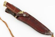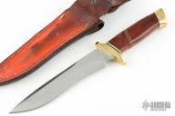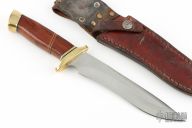 This knife by LC Smith features a satin finished blade with false top edge, .214" blade stock and 1.340" blade depth, hidden tang construction. The handle has a brass guard and butt, cocobolo grip with red/white/black/brass spacers. Comes with a brown leather sheath. Has scratches and patina, has been resharpened, otherwise good condition.