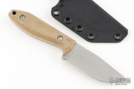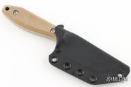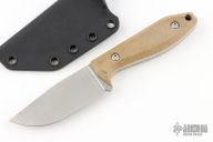 This Hiker by Terra Knives features a satin finished blade with notched thumbrest, .183" blade stock and 1.145" blade depth, full tang construction. The handle has natural micarta scales and lanyard hole. Comes with a kydex sheath. Has some light scratches on the blade, excellent condition otherwise.