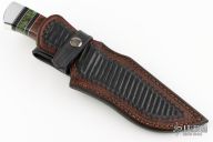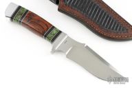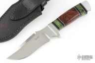 This Camp Knife by Alan C Warren features a hand rub satin finished blade with false top edge and notched thumbrest, .212" blade stock and 1.715" blade depth, hidden tang construction. The handle has a stainless steel guard and aluminum butt, desert ironwood grip, black/nickel silver/green maple burl spacers. Comes with hand tooled black/brown leather sheath. New condition. #2540