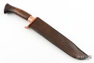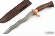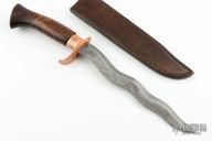 This Serpentine Fighter by Paul Cooper features a hand forged Damascus Kris blade with false top edge, Damascus is 1095 and Wrought Iron, .220" blade stock and 1" blade depth, hidden tang construction. The handle has a copper guard and collar, red oak grip with heirloom fit. The handle has a nice swell at the butt and a copper butt plate. Comes with a brown leather sheath with belt loop. Excellent condition. Really cool piece! This knife was photographed by "SharpbyCoop". Check it out HERE.