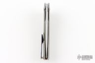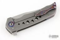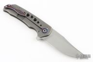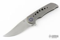 This Wyvern flipper from Walter Randolph features a hand rub satin finished RWL-34 blade with flipper. The bead blasted titanium frame features white Timascus pivot collars, pocket clip, and floating backspacer. Pocket clip is positioned for tip up carry. Nice detent, lockup and blade seating. Has scuffs and scratches, has been used, otherwise good condition.