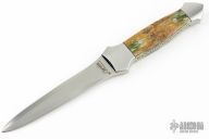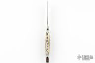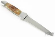 "I made my first knife in 2008 under the direction of my friend and mentor Rusty Preston. We are blessed to have a vacation home across the street from Rusty in Port Isabel, Texas. As most of you know Rusty is a well known slip joint maker and so my early knives were also slip joint folders. In 2009 I started making fixed blades and the majority of my knives since have been fixed blades. The file work I learned to do on the early folders has been very helpful in making the fixed blade knives appealing to collectors and has proven to be a real niche. I have come a long way in a few years with help from guys like Rusty and Steve Johnson. I was very fortunate to spend some time in Steve's shop early 2011, what an amazing opportunity. With the help and knowledge gleaned from these guys I was able to win the best new maker award at the 2011 Blade show in Atlanta with a mammoth tooth fighter. Most of my fixed blades now feature mammoth tooth or fossil coral. I also do a lot of mammoth ivory and stag."