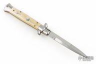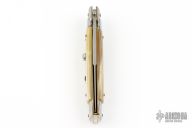 This Left Handed 9" Picklock by Frank Beltrame features a tumble polished bayonet ground blade with false top edge. The handle has stainless steel bolsters, front and rear, honey horn scales, brass liners and stainless steel spring. Excellent condition.