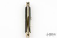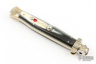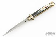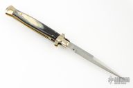 This 10" Picklock by Tony Sandoval features a hand rub satin finished blade with false top edge, .179" blade stock. The handle has nickel silver bolsters, front and rear, buffalo horn scales, brass liners. Nickel silver button and safety. Has a few light scratches and a little blade play, excellent condition otherwise.
