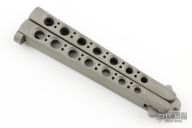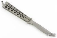 This early balisong from Pacific Cutlery features a Jody Samson ground bead blast finished blade with false top edge. The handles are stainless steel with hole pattern. Comes with original nylon sheath and box. Has some light scuffs and scratches, excellent condition otherwise.