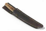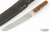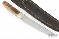 This knife by Shiva Ki features a satin finished blade with .179" blade stock and 1.150" blade depth, full tang construction. The handle has dovetailed nickel silver bolsters, sheep horn scales with nickel silver pins. Comes with a brown leather sheath. Has some light scratches, otherwise excellent condition.
