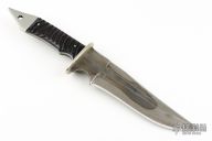 This Mercenary from Shiva Ki features a recurve double edge blade made with Samurai Steel, has a nice hamon, .198" blade stock and 2.024" blade depth, full tang construction. The handle is comprised of a nickel silver guard and rear bolsters with black horn scales. Has a few light scratches, the very tip is broken off, otherwise excellent condition.