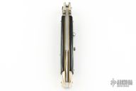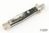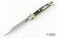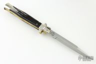 This Picklock Auto by Renzo Passcotto features a mirror finished blade with unsharpened edges. The handle has Brazilian horn scales, brass liners and nickel silver bolsters. Has safety. Excellent condition. 50 of these were made.