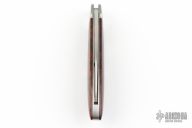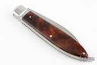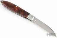 This Slipjoint by Ricardo Romano features a hand rub satin finished blade with nail nick. The handle has fluted stainless steel bolsters, desert ironwood burl covers with stainless steel escutcheon, stainless steel liners and spring. Has half-stop, flush in all positions. Excellent condition.
