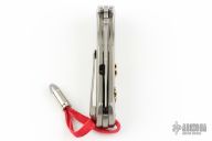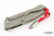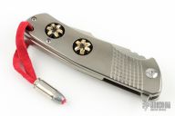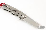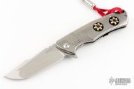 This flipper by Michael Zieba features a satin finished blade with notched thumbrest and flipper. The handle has a titanium frame with milling, has a matching backspacer and tip up clip. Has two "expanded bullets" inset in the handle. Nice detent, lockup and blade seating. Rides on bearings. Has stainless lockbar insert. Comes with original hard case and COA dated 9-11-16. Excellent condition.