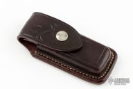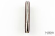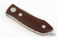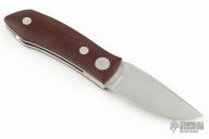 This Barry Wood design swing lock folder features a satin finish blade and satin finish stainless steel frame with maroon linen micarta scales. This is a very unique scissor opening folder, which when the blade is fully open and locked in place is almost a fixed blade knife. The handle is nicely contoured for a comfortable grip. Opening is accomplished by lighting pressing down and outward at the rear indentation on the spine, which releases the locking pin and allows one side of the handle and the blade to rotate down then forward until the blade locks in the forward position. The one side of the handle continues to rotate back until it locks in place. Closing requires the same slight thumb pressure at the indentation to release the locking pin, then the one side of the handle is rotated back and around, catching the blade and aligning both with the other side of the handle in a locked closed position. Comes with a leather Colt belt sheath and the original box. Has a couple light scratches, otherwise excellent condition.