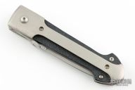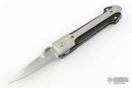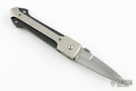 This linerlock folder from Mel Pardue features a hand-rubbed satin finish dagger style blade with a false top edge, orange peel finished overlays and black g10 liner, and jeweled titanium liners. Nice lockup, detent and blade seating. Excellent finish work. Has a couple light scuffs, excellent condition.