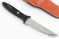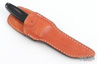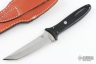 "It is only natural that Spyderco follow-up Bob Lum's folding tanto with a fixed blade, and a very classy one at that. It has a Hamaguri (appleseed) grind at the tip for added strength and the swedge on the spine lessens the overall weight. The blade has a tapered Tang, running the full length of the handle, adding overall strength. The expanded hand guard, where the blade and handle meet, makes it comfortable while gripping. Blade is hollow ground." The FB03 is a discontinued model no longer available from Spyderco. Includes original brown leather sheath and box. Comes with an additional custom brown leather sheath. Has some scratches, otherwise good condition.