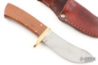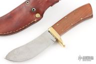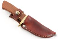 This knife by Buck Hall features a satin finished blade with .120" blade stock and 1.296" blade depth, full tang construction. The handle has a brass guard, wood scales and brass pins. Comes with a brown leather sheath. Has some scratches and oxidation, otherwise good condition.