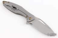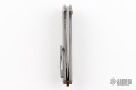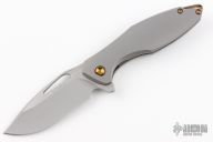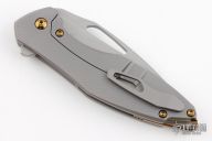 This Mini Arius by Koenig knives features a Purnished w/ PF finished blade with thumbhole and flipper. The handle has a bead blasted Corda pattern titanium frame with a titanium tip up clip, anodized titanium backspacer. Has ceramic bearings and a ceramic detent ball. Nice detent, lockup and blade seating. Comes with original box and COA July 19, 2024. New condition.