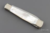 This knife by Weidmannsheil features mirror polished blades with nail nicks. The handle has nickel silver bolsters, mother of pearl covers, brass liners and stainless steel springs. Has a few light scratches, otherwise excellent condition. Comes with original box.