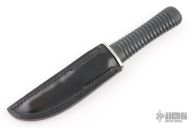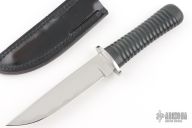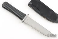 This Tanto by Kuzan Oda was produced by Pacific Cutlery in Japan. It has a mirror finished blade with a simulated hamon, .178" blade stock and 1.194" blade depth, hidden tang construction with a black rubber handle. Comes with a black leather sheath. Has a few scuffs/scratches otherwise the knife is in excellent condition.