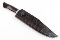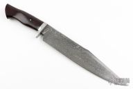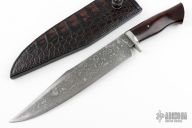 This Bowie by Master Smith Jason Knight features a Damascus blade with a sharpened top edge, nice distal taper, .329" blade stock and 1.912" blade depth, hidden tang construction. The handle has a stainless steel guard with a desert ironwood burl grip. Comes with a black/brown leather sheath with alligator skin overlay. Excellent condition.