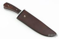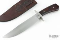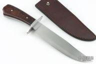 This "Carbon Fighter" by Journeyman Smith Mike Ruth features a hand rub satin finished blade with visible temper line and false top edge, .324" blade stock and 1.752" blade depth, hidden/frame tang construction. The handle has a polished stainless steel guard and collar, desert ironwood burl scales over a stainless steel frame. Comes with a brown leather sheath by Kenny Rowe's Leather. Excellent condition. Comes with COA