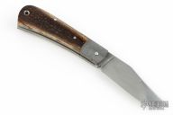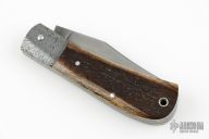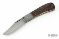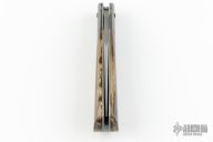 This Little Bad slipjoint by Franck Souville features a hand rub satin finished blade with nail nick. The handle has dovetailed Damascus bolsters, bark mammoth ivory covers, blasted titanium liners, Damascus spring. Has a nice snap and the blade is centered. Comes with a zippered case. Excellent condition.