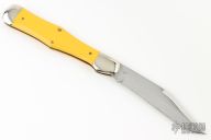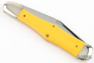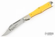 This Slipjoint by Queen Steel features a mirror polished clip point blade with nail nick. The handles have nickel silver bolsters and yellow covers, brass liners and steel backspring. Have a few light scratches, has a small crack in each scale, otherwise good condition. Comes with original box.