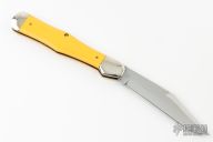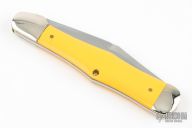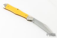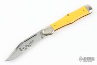 This Slipjoint by Queen Steel features a mirror polished clip point blade with nail nick. The handles have nickel silver bolsters and yellow covers, brass liners and steel backspring. Have a few light scratches, has a small crack in one of the scales, otherwise good condition. Comes with original box.