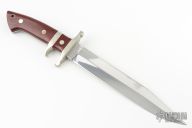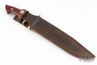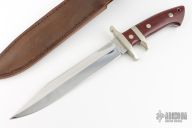 This Sub Hilt Fighter from Steve Voorhis features a mirror polished clip point blade with sharpened top edge, .222" blade stock and 1.218" blade depth, full tapered tang construction. The handle is comprised of a nickel silver guard, sub hilt, pins and lanyard tube with red linen micarta scales over black liners. #71017 on blade. Comes with brown leather sheath. Some light scratches and a couple small spots on the blade, otherwise excellent condition.
