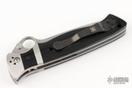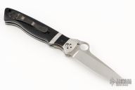 This Vallotton Sub-Hilt Auto by Spyderco was converted by Butch Vallotton, it features a satin finished S30V blade with a thumb-hole, dual thumb-studs, and notched thumb-rest. The handle has stainless steel bolsters, black G-10 scales, stainless steel liners, black G-10 backspacer, and 4-way reversible black stainless steel clip. Nice detent, lockup and blade seating. Comes with original box and papers. Can be opened manually or as an auto. Has a couple light scratches, otherwise excellent condition.
