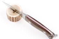 This knife by Marcus Lin has a mirror polished blade and sharpened top edge, .172" blade stock and .860" blade depth, full tapered construction. The handle has stainless steel bolsters, green canvas micarta scales with red liners. #423 on ricasso. Has a couple very light scratches, otherwise excellent condition.