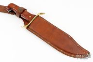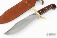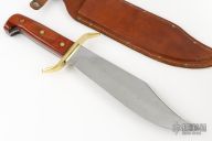 This W49 Bowie by Western Cutlery features a mirror polished bowie blade with a false top edge, .170" blade stock and 2.106" blade depth, full tang construction. The handle has a brass s-guard, dymondwood scales with brass pins. Comes with a brown leather sheath. Has some light scratches and patina, otherwise good condition.