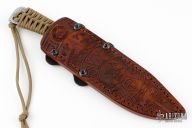 The Sheath: Custom leather sheath with RMJ details ranging from Uncle Stumpy to the Crusader Shield, finished witha reddish brown dye and orange stitching, and black leather OWB loop.