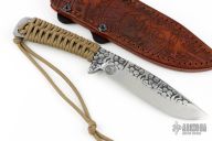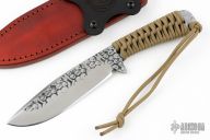 Hand forged by Ryan Johnson at the Gold Point Forge! The Catacombs Knife from Ryan has a near perfect balance of function and form making it a solid choice for most anything you encounter. The convex ground drop point blade profile is a great general use shape with a large belly for slicing, and features a forged Catacombs pattern on the blade 'flats' for some extra killer looks! The tapered tang design keeps the weight down without sacrificing strength and has been cord wrapped for a solid and secure grip without being abrasive. Comes with a custom leather sheath with RMJ embossings and OWB loop.