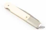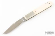This Grigg Lockback Folder has a satin finished clip point blade with nail nick. The handle has nickel silver bolsters, nickel silver liners, and stainless steel spacer and lockbar, walrus ivory scales. Nice lockup and blade seating. Excellent condition.  Comes with a "Randall Made Knives" brown leather sheath marked "G4" on the back.