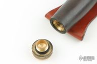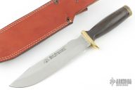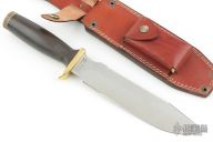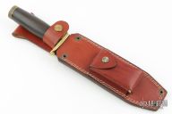 This knife by Carl Schlieper features a satin finished blade with sawteeth on the spine and notched thumbrest, .194" blade stock and 1.452 blade depth, hidden tang construction. The handle has a brass guard, black composite handle and brass butt cap with compass that is removable to access the storage in handle. Comes with a brown leather sheath. Has a couple light scratches, otherwise excellent condition.