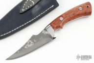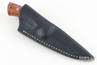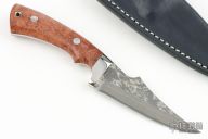 Custom Gun Blade Knife has unique a Grayish VG-10 blade core and outer cladding layers of forge laminated Nickel-Stainless Damascus steel. The shinning white/silver Nickel Steel layers have a vivid, aggressive, yet beautiful appearance. The 4.1' VG-10 Damascus Blade is matching with the custom handmade Quince Burl Wood Handle. Mr. Katayama cares very much for overall balance and appearance. The unique Gun-Blade Custom Knife also feasures a full tang construction, a stainless steel hilt, rivets and lanyard hole. A Graysh Color handmade Leather sheath, with belt loop, is also included.