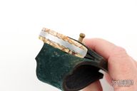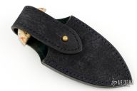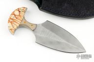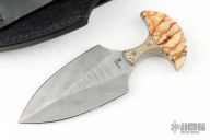 This Push Dagger by Francesco Pachi features a Stainless Damascus blade with textured flats, .231" blade stock and 1.653" blade depth, full tang construction. The handle has mokume bolsters, tiger coral scales with 14k gold pins, fileworked tang. Comes with a black shark skin leather sheath and a nylon zippered case. Comes with COA dated November 2001. Has a small spot on each side of the blade, excellent condition.