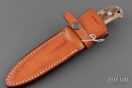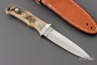 This boot knife by the Late Masao Takahashi features a mirror polished dagger blade with .198" blade thickness and .800" blade depth, full tapered tang construction. The handle has a nickel silver guard with mammoth scales. Comes with a brown leather sheath. Excellent condition.